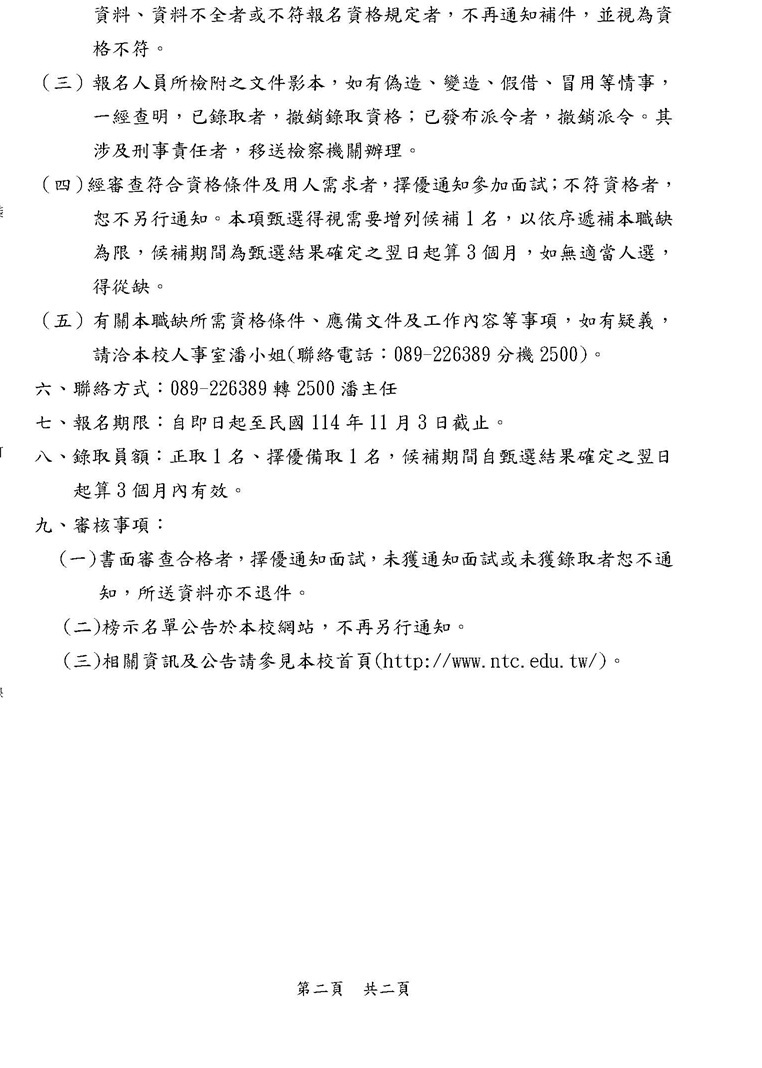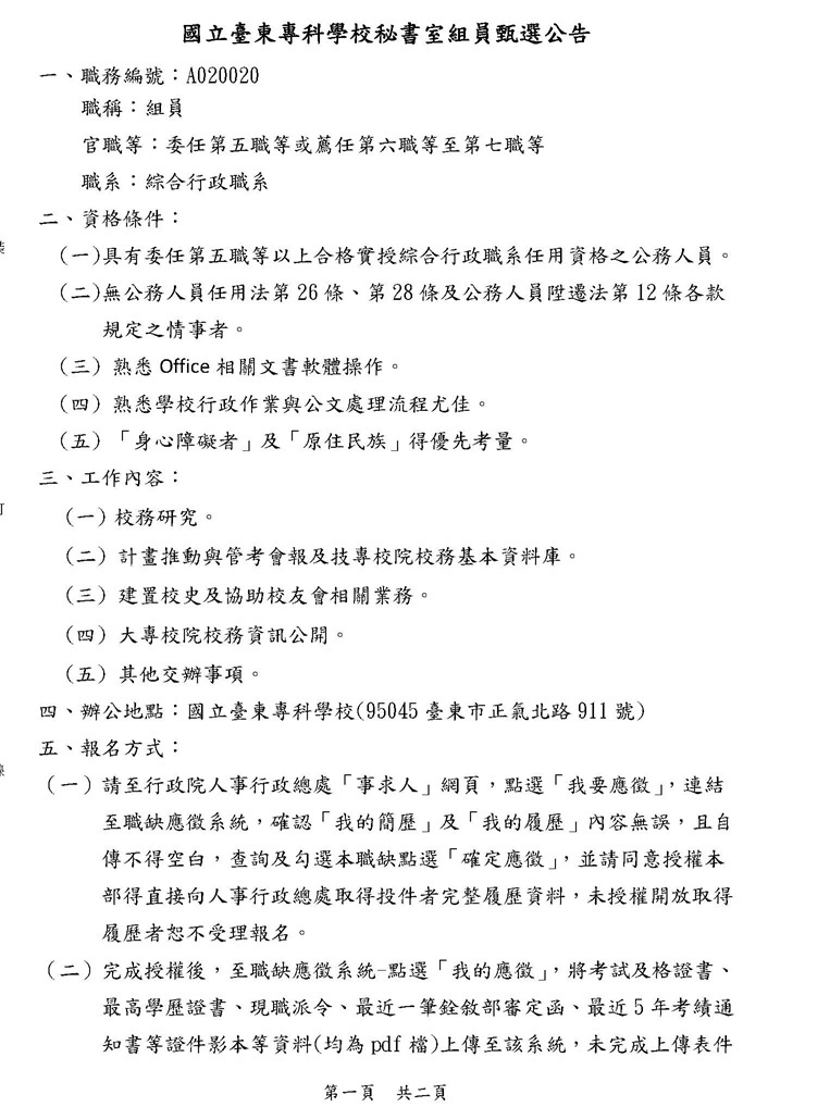 【人事室公告】國立臺東專科學校秘書室組員甄選公告