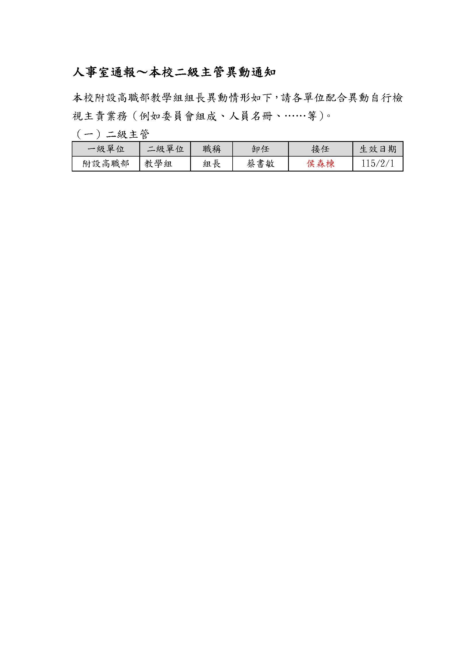 【人事室公告】公告本校附設高職部教學組組長異動名冊。